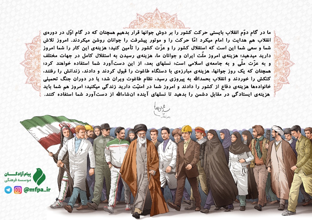«ما در گام دوّم انقلاب بایستی حرکت کشور را بر دوش جوانها قرار بدهیم همچنان که در گام اوّل در دورهی انقلاب هم هدایت را امام میکرد امّا حرکت را و موتور پیشرفت را جوانان روشن میکردند. امروز تلاش شما و سعی شما این است که استقلال کشور را و عزّت کشور را تأمین کنید؛ هزینهی این کار را شما امروز دارید میدهید؛ هزینهی امروز ملّت ایران و جوانان ما، هزینهی رسیدن به استقلال کامل در جهات مختلف و به عزّت ملّی و به جامعهی اسلامی است؛ نسلهای بعد، از این دستآورد شما استفاده خواهند کرد؛ همچنان که یک روز جوانها، هزینهی مبارزهی با دستگاه طاغوت را قبول کردند و دادند، زندانش را رفتند، کتکش را خوردند و انقلاب بحمدالله به پیروزی رسید، نظام طاغوت ویران شد؛ یا در دوران جنگ تحمیلی خانوادهها هزینهی دفاع از کشور را دادند و امروز شما در امنیّت دارید زندگی میکنید؛ امروز هم شما باید هزینهی ایستادگی در مقابل دشمن را بدهید تا نسلهای آینده انشاءالله از دستآورد شما استفاده کنند.»